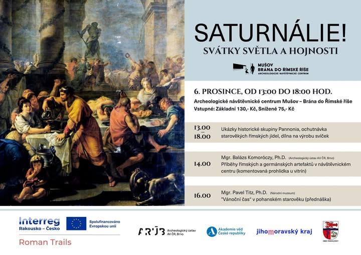Čeká vás slavnostní atmosféra římských Saturnálií, ukázky historické skupiny, ochutnávka starověkých jídel, dílna na výrobu svíček, komentovaná prohlídka římských a germánských artefaktů i odborná přednáška o zimních starověkých rituálech.